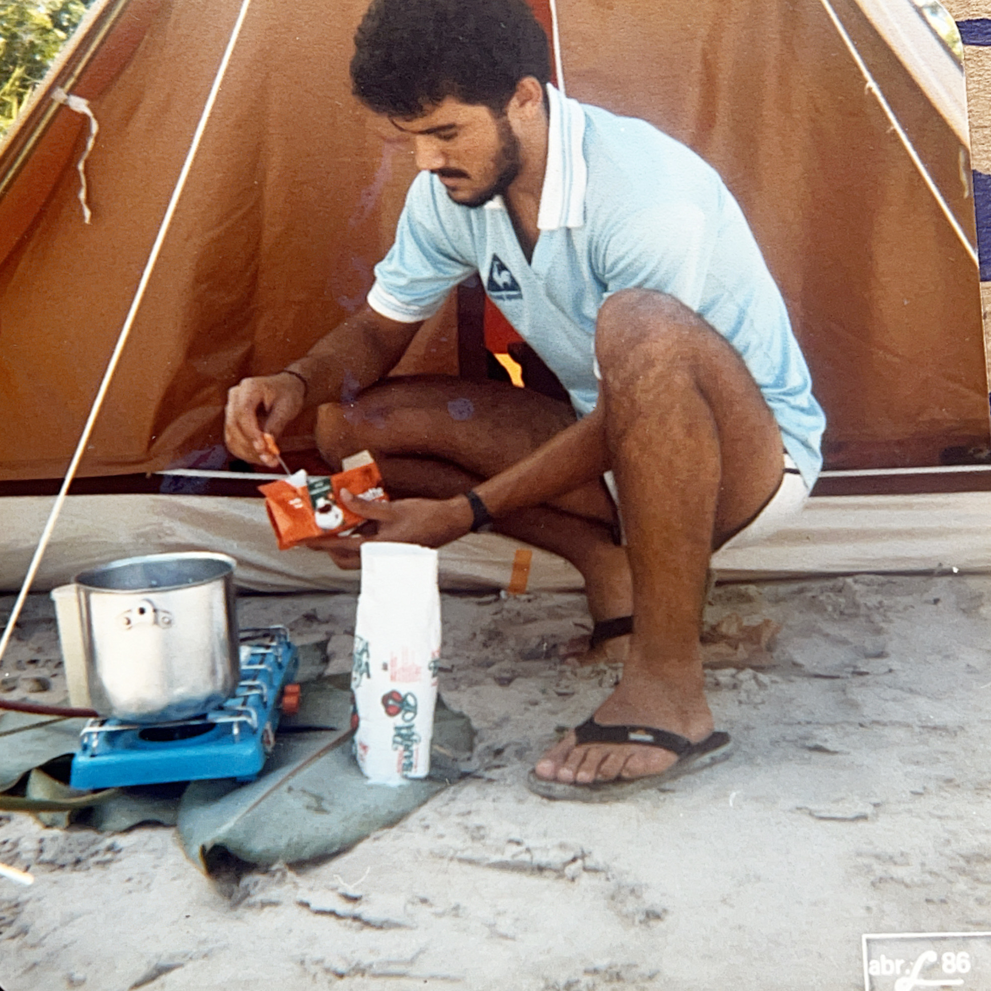 Em 1984, meu pai, Célio Santana, conhecido por todos como “Bigode”, começou a fazer suas primeiras trilhas ainda jovem, explorando lugares como Bertioga, Paranapiacaba e a Pedra do Baú. Foi ali que nasceu uma conexão muito forte com a natureza e com a vida ao ar livre.